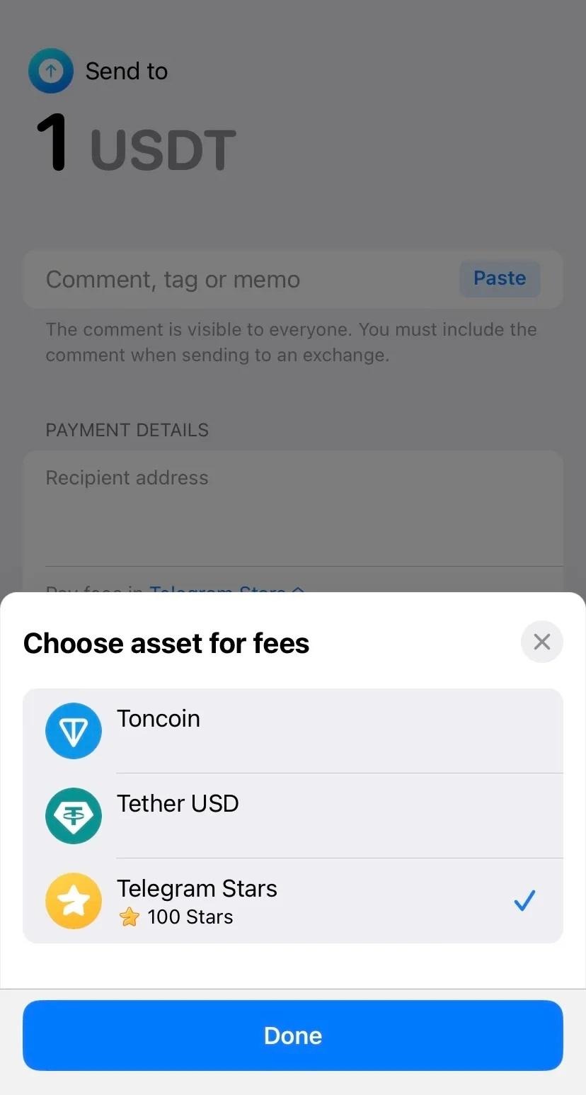 Tokenlarni yuborish yoki almashtirishda yulduzlardan TON tarmoq komissiyalarini toʻlash uchun foydalanishingiz mumkin.