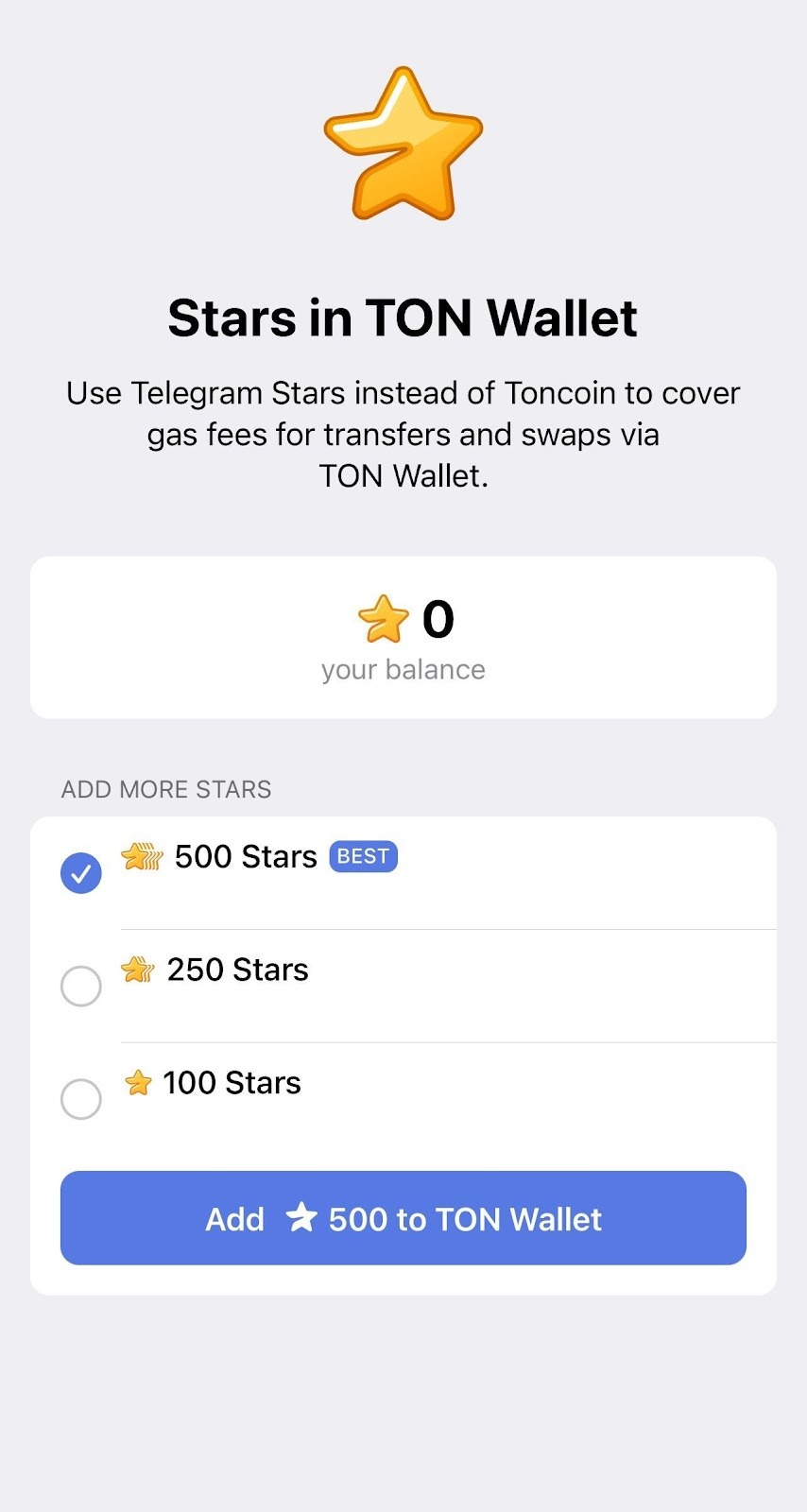 Eslatma: Telegram yulduzlarini TON Hamyonda almashtirib bo‘lmaydi — ular faqat TON tarmoq komissiyalarini to‘lash uchun ishlatilishi mumkin.