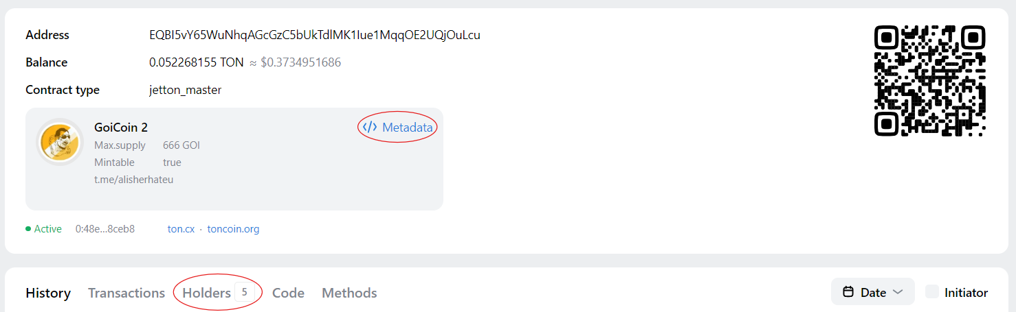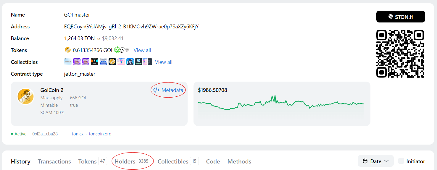 Agar siz jetton sahifasini taqsimlangan ledjer (blokcheyn) tadqiqotchisida (masalan, Tonviewer) ochsangiz, uning shartnoma manzili, qiymati va egalar sonini ko‘rishingiz mumkin. Xuddi shu nomga ega bo‘lgan tasdiqlangan va tasdiqlanmagan jettonlar uchun ushbu komponentlar farq qilishi kerak.