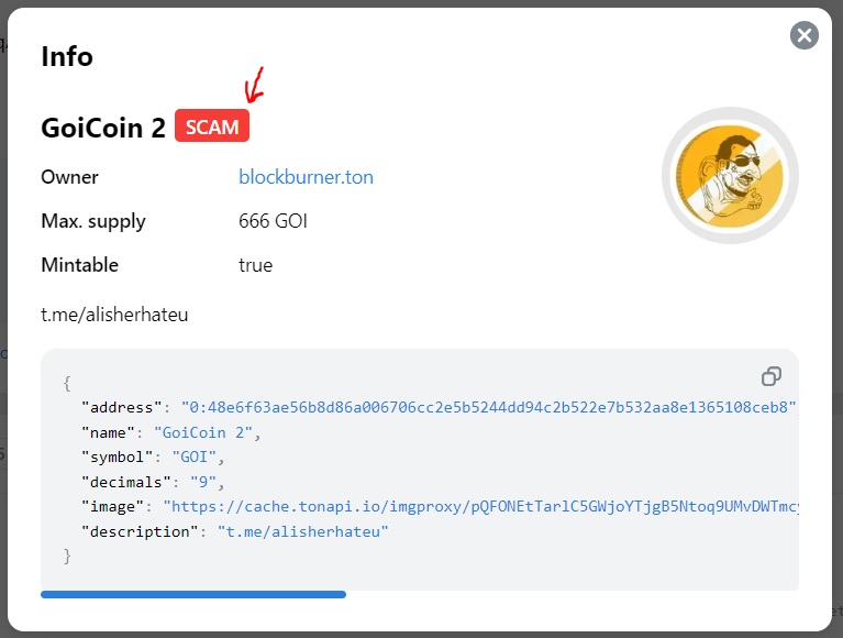 TON tarmog'ida har qanday foydalanuvchi har qanday nom bilan o'z jettonini yaratishi mumkin. Hatto mashhurroq kripto aktivda o'xshash yoki bir xil nom bilan ham.