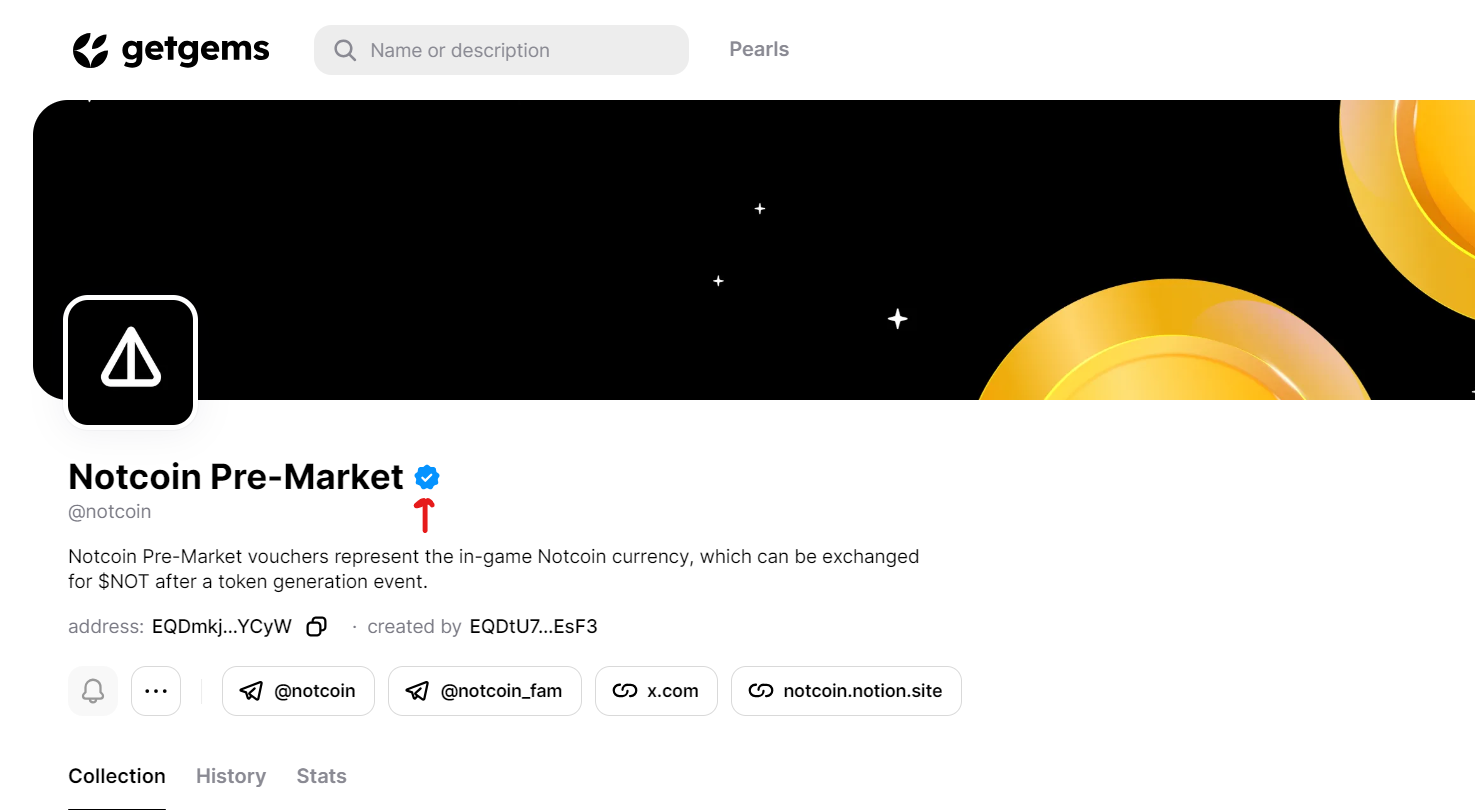 Agar siz Getgems (TON tarmog'i uchun asosiy NFT platformasiga) o‘tsangiz, ma'lum bir to'plamni qidirishingiz mumkin. Rasmiy to'plamlar "tasdiqlangan" belgisiga ega bo‘ladi.
