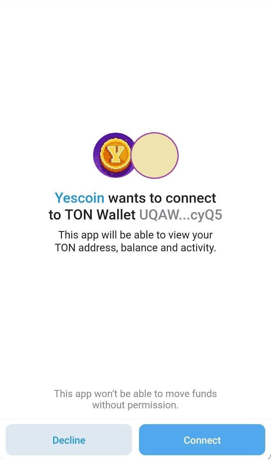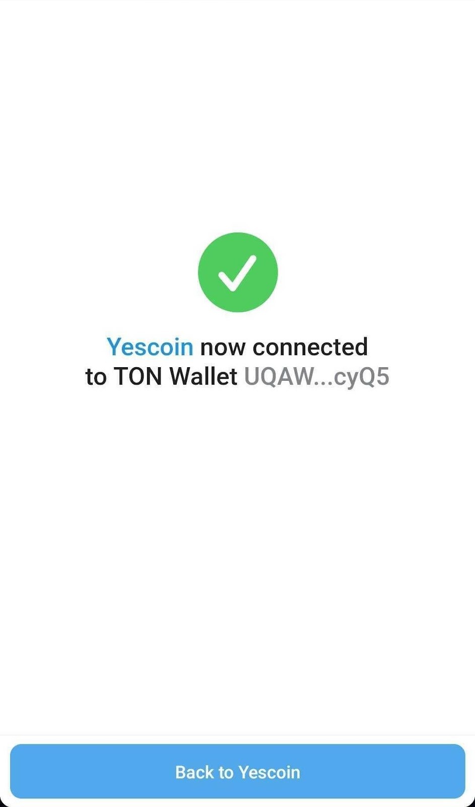 Quyida siz Yescoin ilovasini TON Hamyonga ulash misolini ko'rishingiz mumkin. Shuni esda tutingki, ushbu misol faqat tasvirlash uchun berilgan va tavsiya yoki maslahat sifatida ko'rib chiqilmaydi yoki talqin etilmaydi.