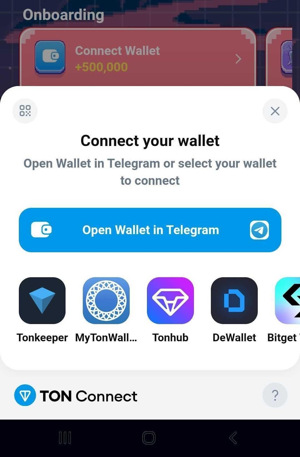Ilova sizni TON asosidagi hamyonni o‘z xizmatiga ulashga taklif qiladi. Keyingi oynada, "Telegramda Hamyon ochish" tugmasini bosib, ulanishni tasdiqlang.