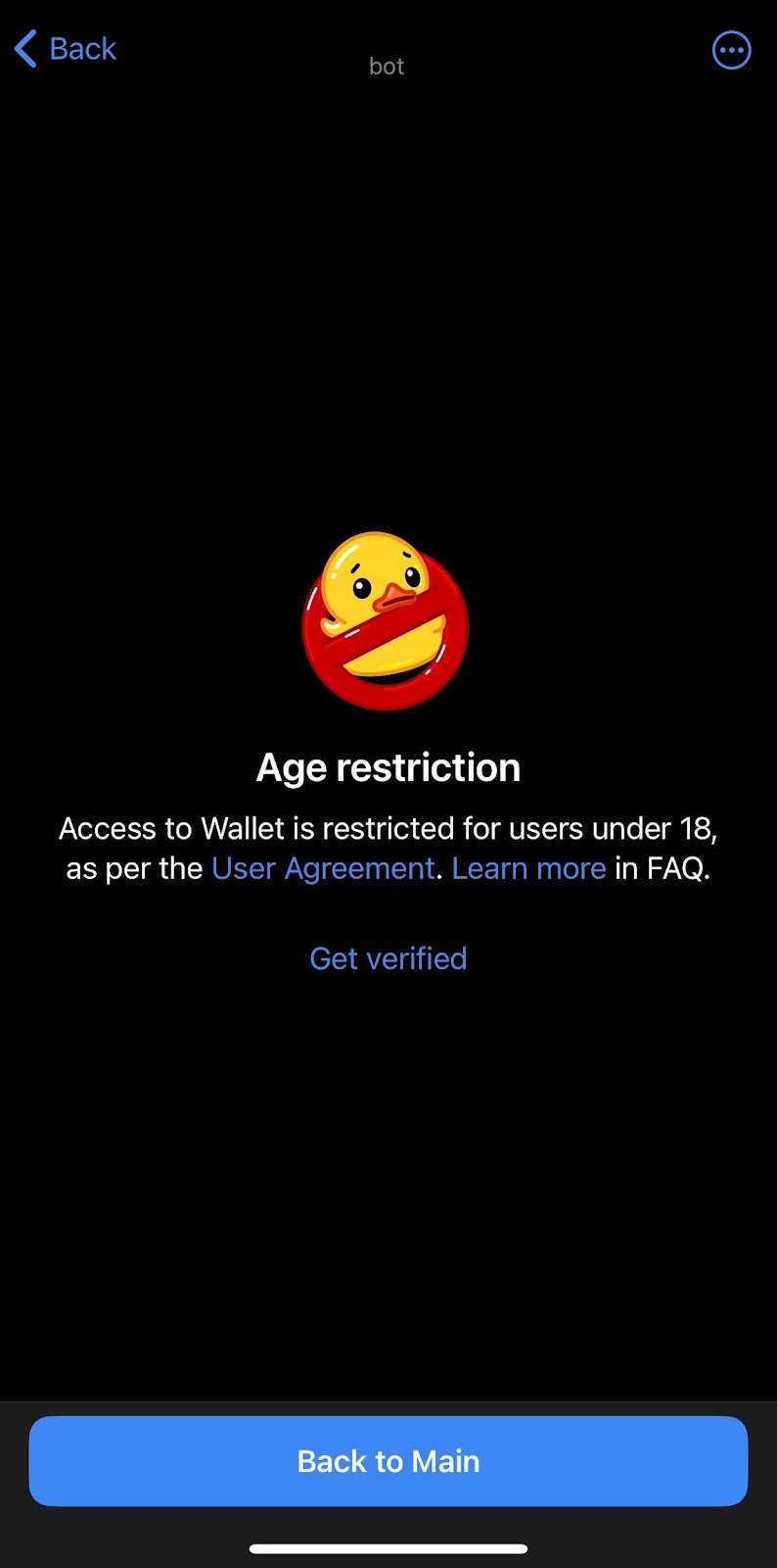 Foydalanuvchi shartnomasiga ko'ra, siz Kripto Hamyondan faqat 18 yoshga to'lganingizdan so'ng foydalanishingiz mumkin, shuning uchun xizmatga erishuvingiz cheklangan.