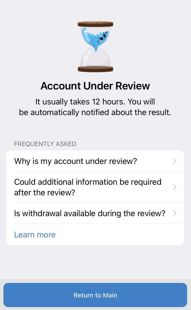 Hujjatlarni topshirgandan so'ng, siz ko'rib chiqish ekraniga o'tasiz. Agar xohlasangiz, uni yopishingiz mumkin – ko'rib chiqish tugallangandan so'ng, biz sizga @wallet chatida natijalar bilan xabar yuboramiz.