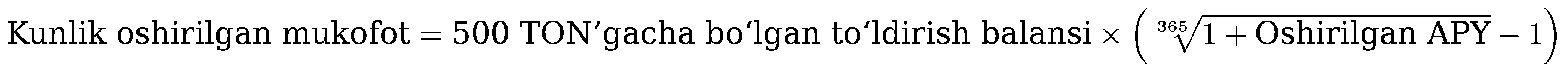 Daromad akkauntingizda kiritilgan birinchi 500 TON uchun 15% APY miqdorida oshirilgan mukofotlar olinadi. Agar Daromad balansingiz 500 TON'dan oshsa, Oshirilgan APY faqat birinchi 500 TON uchun amal qiladi, qolgan qoldiq esa joriy Bzaviy APY'da mukofot oladi. Mukofotlar ushbu maqolada keyinroq tavsiflangan standart formulalar bo'yicha hisoblanadi.