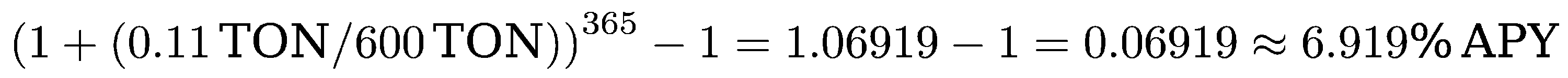 APY (Yillik foizli daromad) sizning Daromad to'ldirishingiz bo'yicha foiz sifatida ifodalangan yillik daromad kursini bildiradi. Oddiy so'z bilan aytganda, agar siz TON to'ldirsangiz, APY sizga bir yil davomida qancha Toncoin to'plashini tushunishga yordam beradi. Siz olgan foizlar keyingi hisob-kitobga o'tadi: Daromadda mablag'larni qancha uzoq saqlasangiz, vaqt o'tishi bilan daromadingiz shunchalik katta bo'ladi.