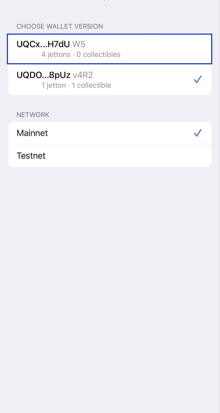 TON Hamyonda siz turli xil hamyon versiyalarini almashtirishingiz mumkin. Maxfiy ibora o'zgarmagan bo'lsa ham, har bir versiyaning o'z manzili mavjud.